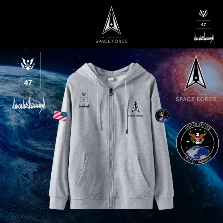 トランプ大統領の前政権時代に創設された宇宙軍のロゴをモチーフに、GOGO TRUMPオリジナルのジップアップパーカーをデザインしました。左右両方の胸元と両袖にトランプ大統領や宇宙軍のロゴをレイアウトしています。ポリエステル混のコットン生地を使用したジップアップパーカーなので、オールシーズン着用できてとっても便利。アジアサイズの造りとなっておりますので、サイズ表の画像をご確認の上、適切なサイズをお選びください。